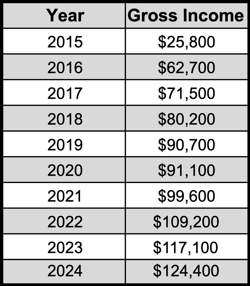 And here’s my historical annual gross income, updated when I file taxes for the prior year: